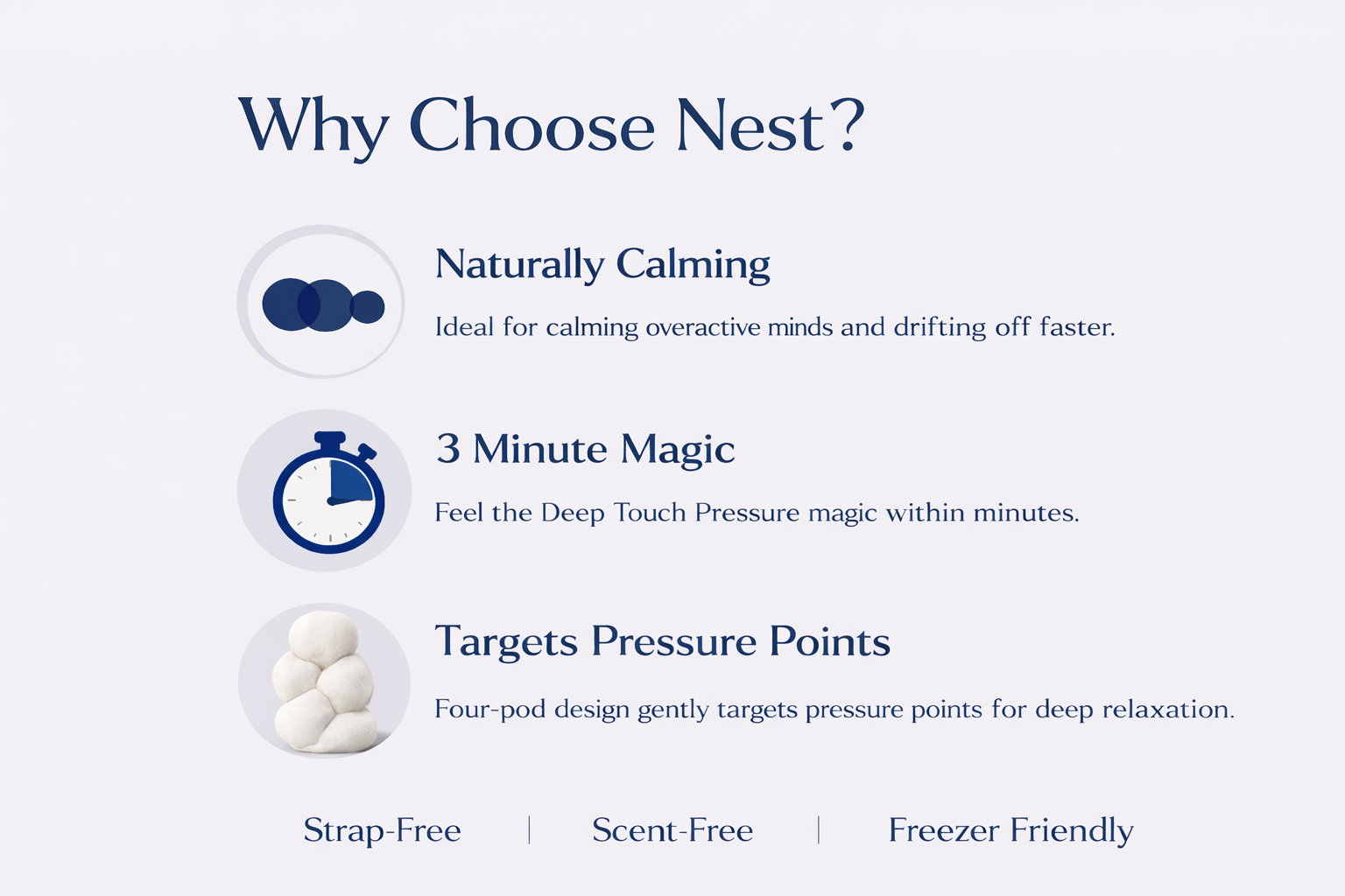 Nest’s ergonomically weighted sleep mask applies soothing, evenly distributed pressure to key facial pressure points—helping reduce overstimulation, relieve headaches, and promote faster, more restorative sleep.